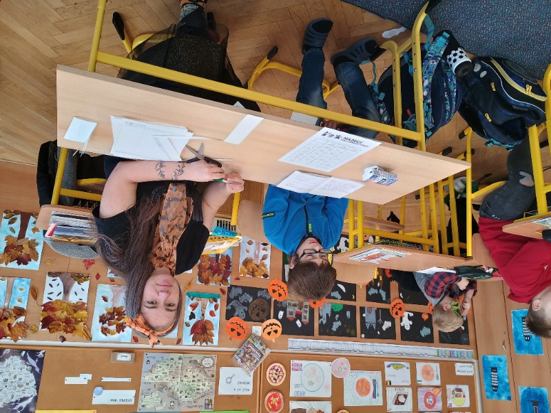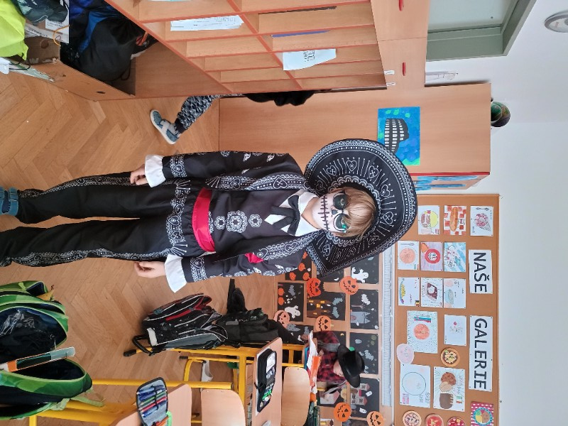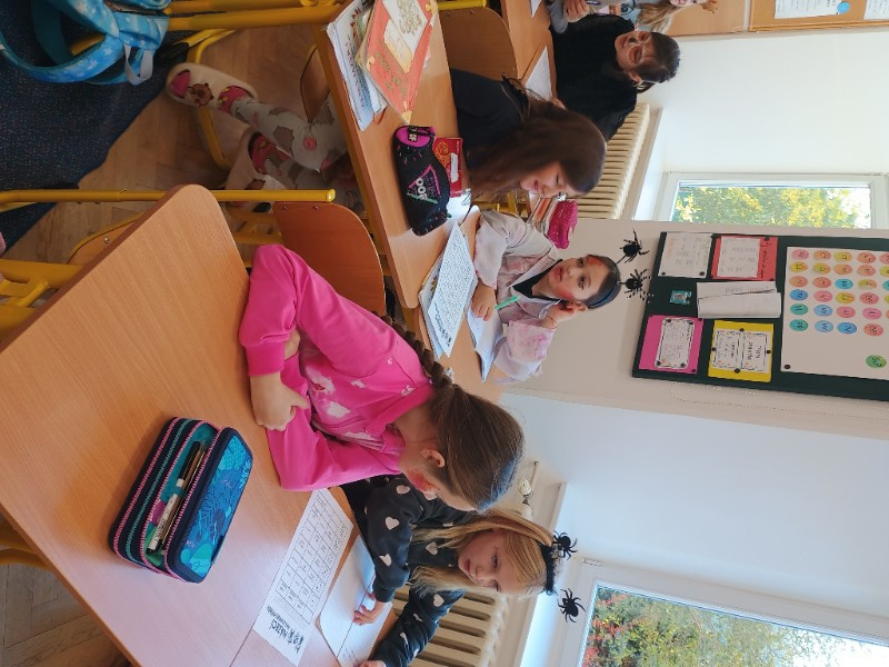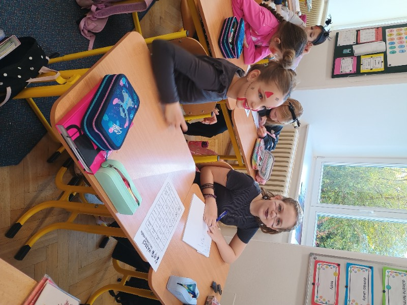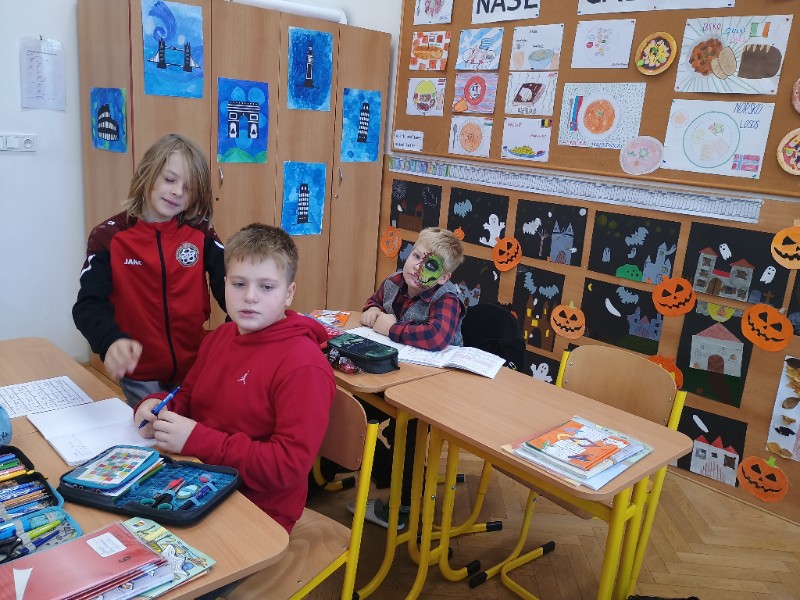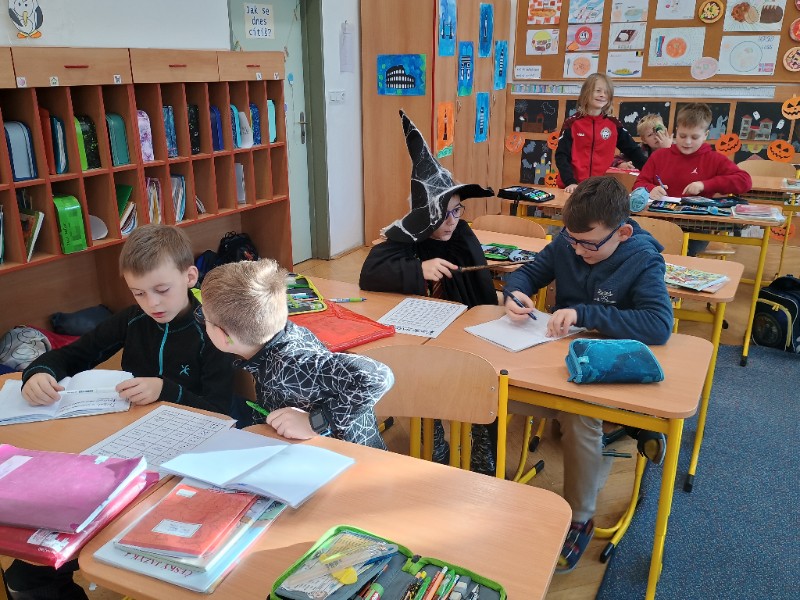 V pátek 31.10. jsme si udělali tematický den Halloween. Kdo chtěl, přišel v masce. Místo běžných hodin jsme vymýšleli strašidelný příběh, kde nám hlavního hrdinu, prostředí a zápletku určil hod kostkou. Čísla v matematice jsme nahradili halloweenskými obrázky a i tak se neděsili a hravé si s tím poradili. Trochu jsme si započítali i u hry košťata a dýně a své halloweenské znalosti ověřili v křížovce.