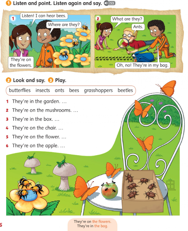 I can hear bees ? Where are they ? - They´re on/ in/ under the flower.